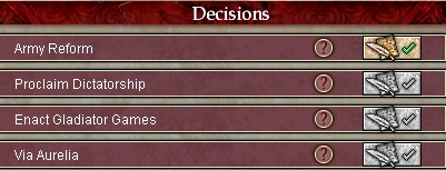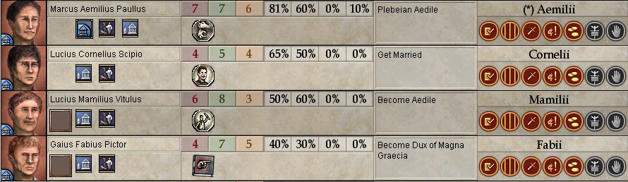 ついでに最高神祇官(Pontifex Maximus)や無職で優秀な奴にも、Augur、Pontifexの官職を与え、宗教派への転向を促す。