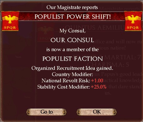 民衆派からコンスルが出た場合のボーナスは反乱率+1に加え、安定度コスト+25%である。