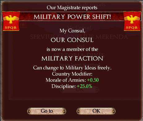 軍事派のボーナスは軍隊の士気+0.50、規律+25%である。