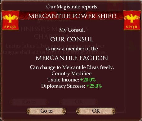 通商派が執政官を出した場合のボーナスが交易収入+20%に加え、外交成功率+25%である。